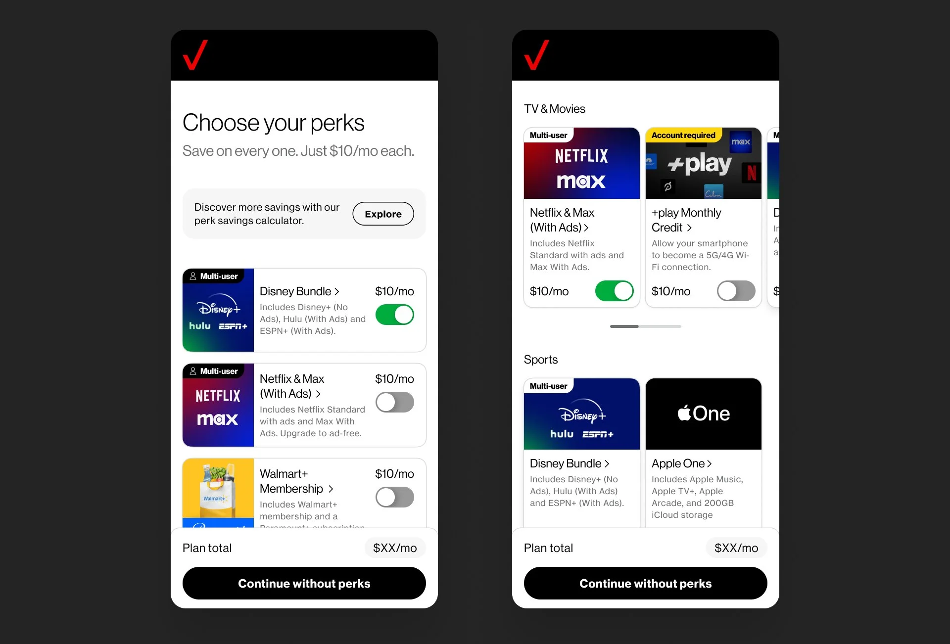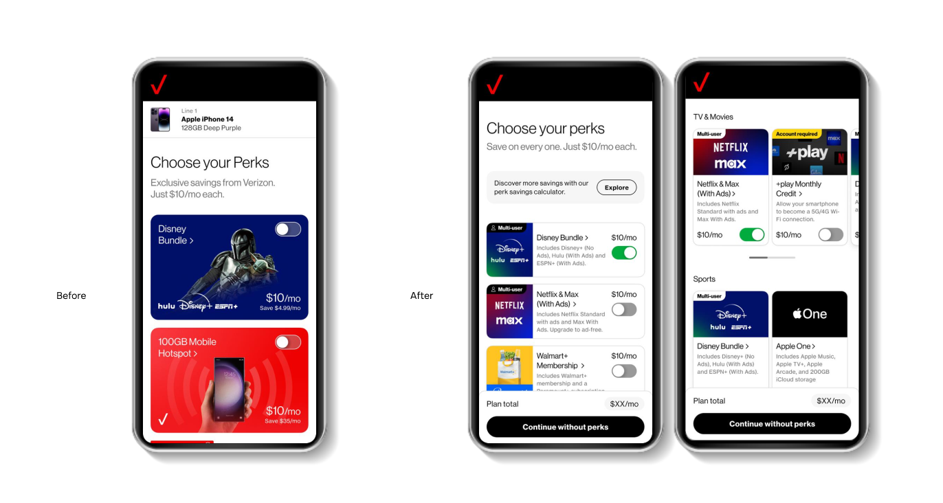 Users often skipped or misunderstood perks during plan selection, impacting activation rates and perceived plan value. The product needed a solution that could scale across plans, support future perks, and remain aligned with Verizon’s design system.